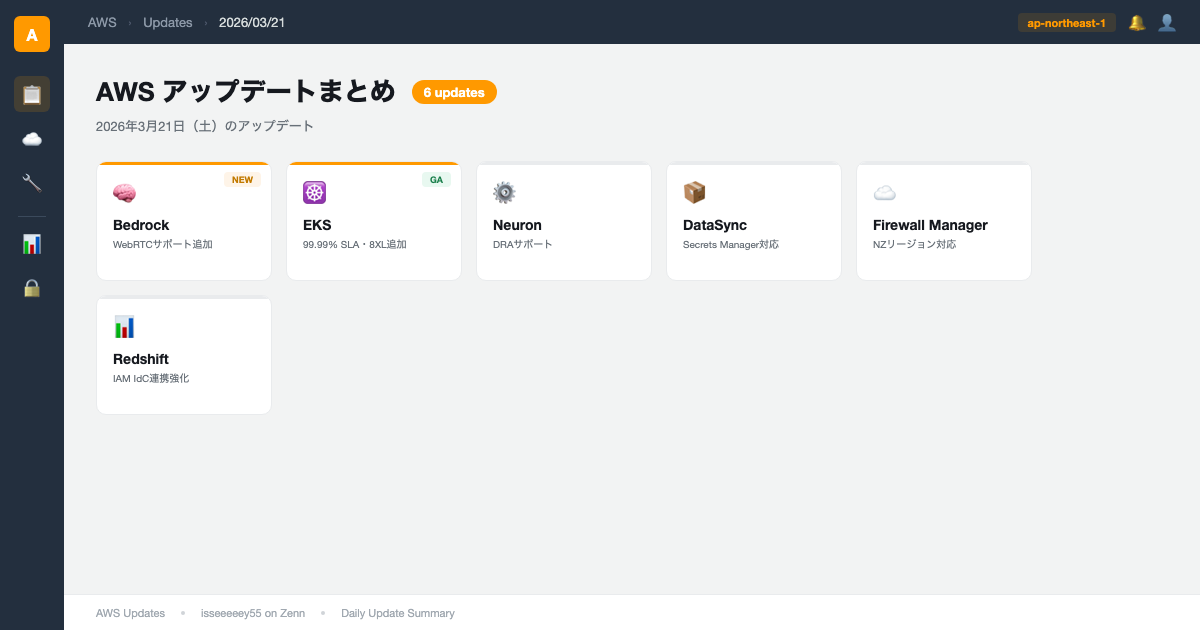 2026年3月21日のAWSアップデートは6件。Bedrock AgentCore RuntimeへのWebRTC追加、EKS Provisioned Control Planeの99.99% SLA・8XLティア新設が目立ちます。ほかにNeuronのDRAサポート、DataSyncのSecrets Manager対応、RedshiftのIAM Identity Center連携強化など。