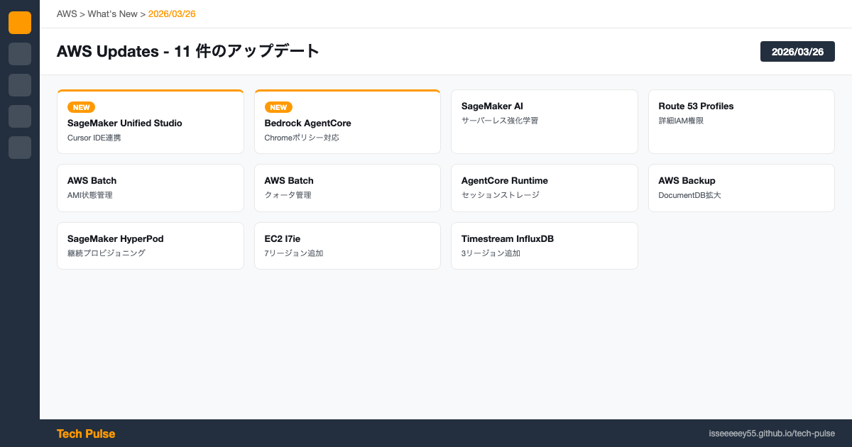 本日は11件のAWSアップデートが発表されました。特に注目すべきは、Amazon SageMaker Unified StudioがCursor IDEからのリモート接続をサポート開始したことと、Amazon Bedrock AgentCoreがChromeエンタープライズポリシーとカスタムルート証明書に対応したことです。これらのアップデートは、MLエンジニアの開発体験向上とエンタープライズ環境でのAIエージェント運用の安全性強化を実現します。また、EC2 I7ieインスタンスの新リージョン展開やAWS BackupのDocumentDBサポート拡大など、インフラストラクチャとデータ保護分野でも重要な進展がありました。