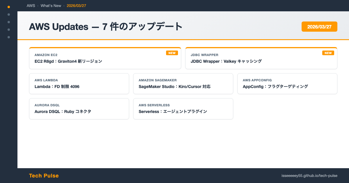 2026年3月27日のAWSアップデートでは、7件の重要な機能強化が発表されました。特に注目すべきは、高性能コンピューティング分野でのGraviton4プロセッサを搭載したEC2 R8gdインスタンスの新リージョン展開と、データベースアクセス最適化を図るAWS Advanced JDBC WrapperでのValkeyキャッシング機能の追加です。これらのアップデートは、パフォーマンス向上とコスト最適化の両面で大きな価値をもたらします。