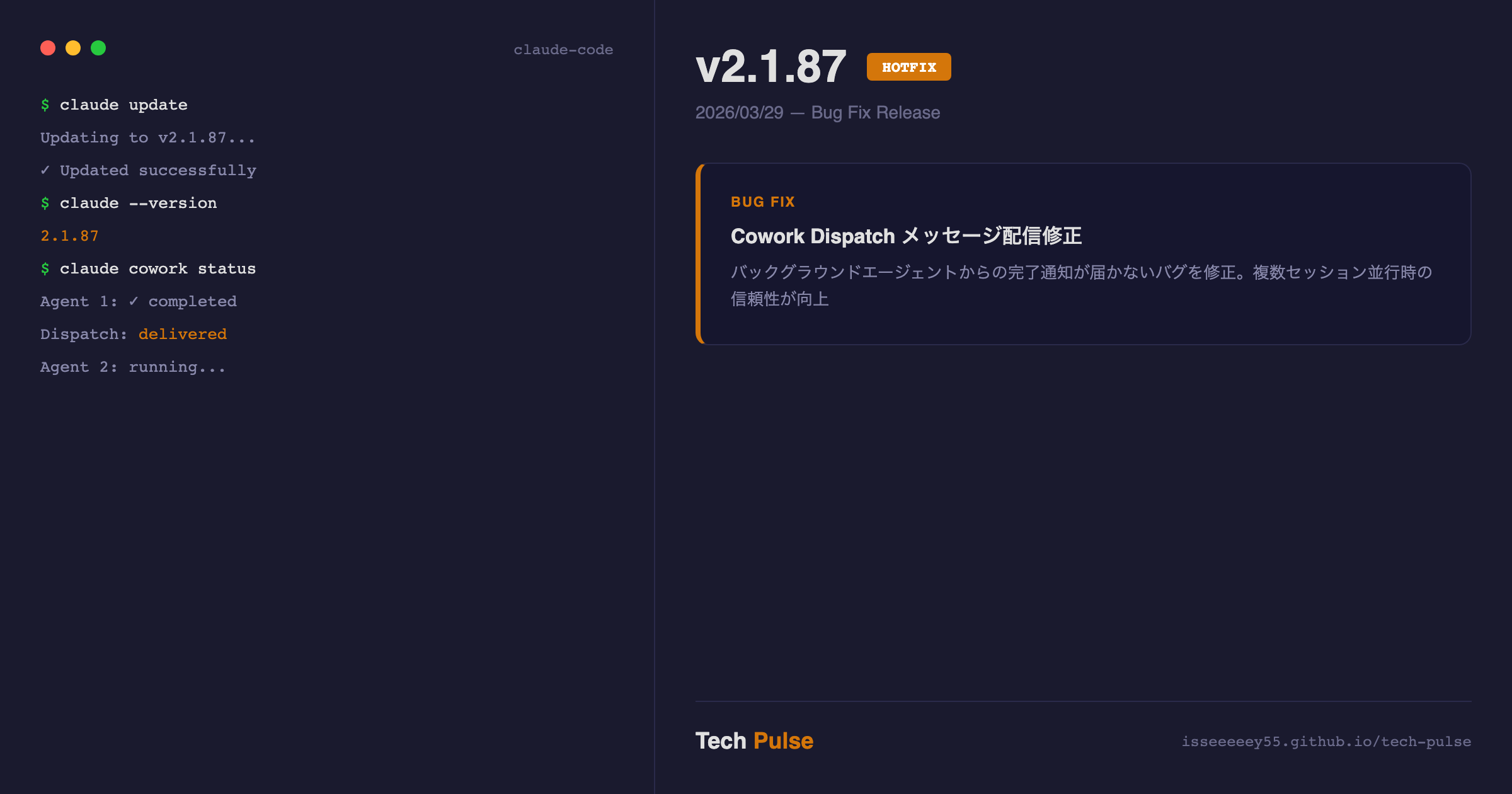 Claude Code v2.1.87 がリリースされました。今回はバグ修正1件のみのホットフィックスリリースです。Cowork 機能のメッセージ配信(Dispatch)が正しく届かないケースがあった問題が修正されています。