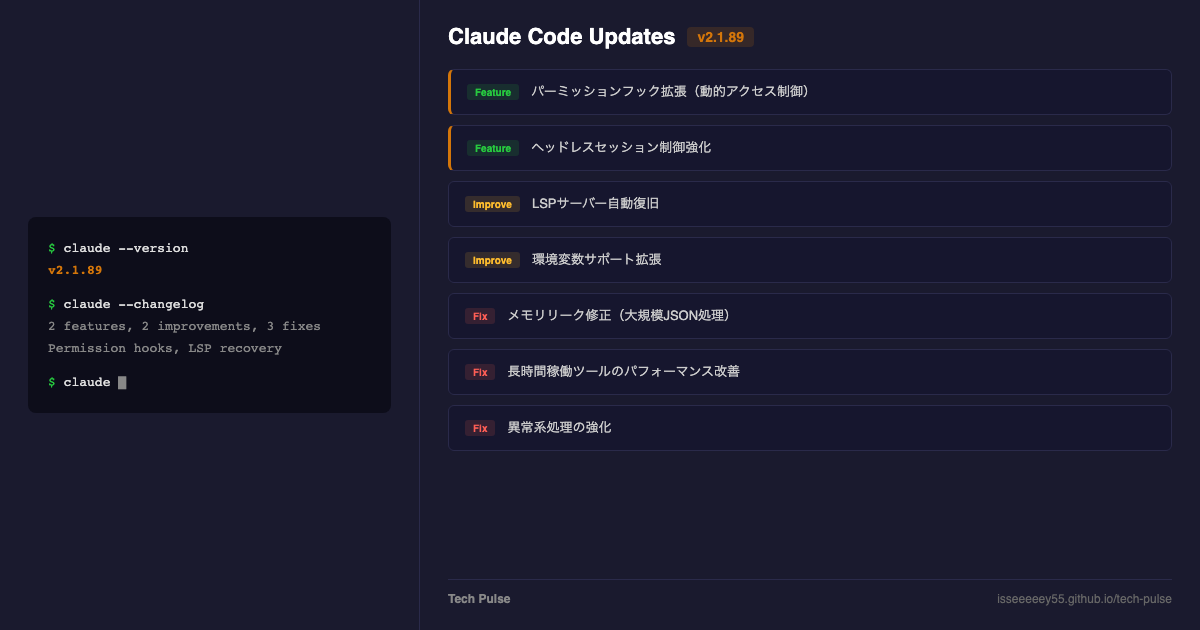 Claude Code v2.1.89がリリースされました。パーミッションフックの拡張による動的アクセス制御、LSPサーバーの自動復旧機能が主な追加です。メモリリーク修正や異常系処理の強化など、安定性の改善も含まれています。