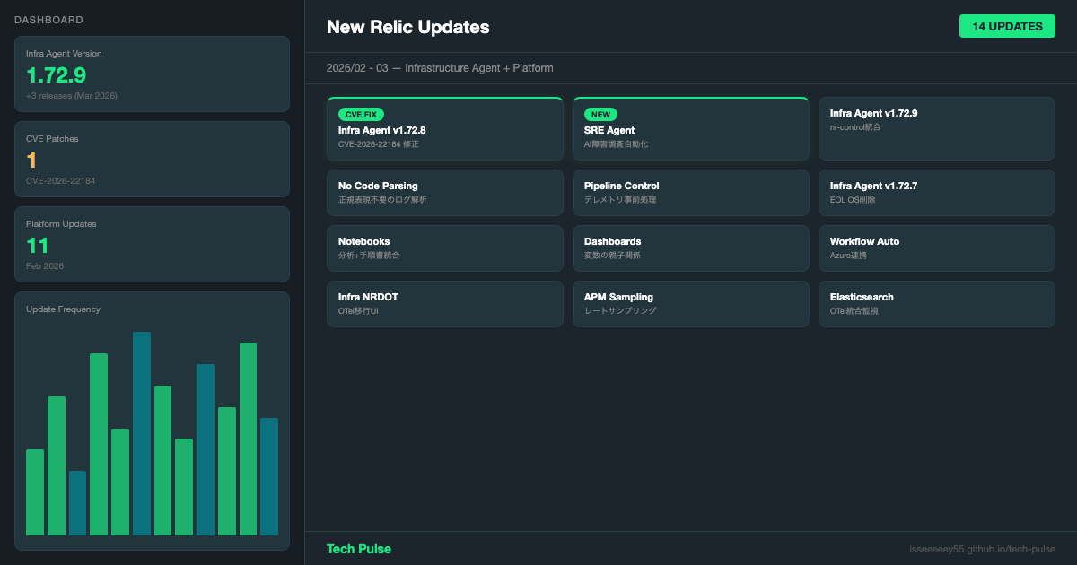 今回は2026年2月〜3月にかけてのNew Relicアップデートをまとめてお届けします。Infrastructure Agentの3リリース(v1.72.7〜v1.72.9)に加え、2月のプラットフォームアップデート11件を取り上げます。